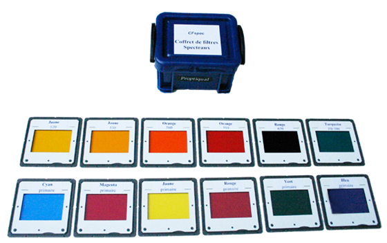 A partir du collège, pour l’enseignement scientifique ou artistique, les coffrets de filtres de Proptiqual permettent, pour un coût modeste, d’étudier les relations entre la perception des teintes colorimétriques et les propriétés spectrales de la lumière filtrée.