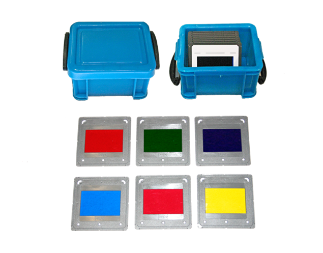 Chaque filtre est monté individuellement dans un cache diapositive afin d’être manipulé avec facilité.