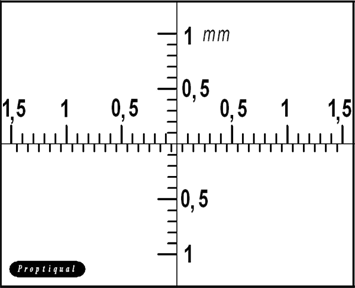 Un réticule comportant une échelle graduée en mm permet ensuite de mesurer directement les dimensions de l’objet visé dans un champ de 3x2 mm avec une précision de 0,05 mm.